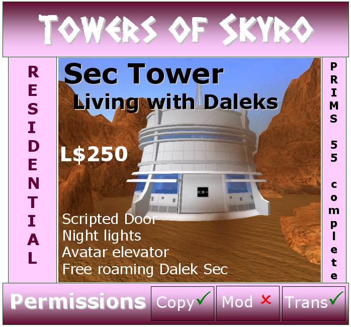 Building on the success of our solar home, we thought about moving into the sci arena, so if you fancy A residence with a difference, Sec Tower is home for Dalek Sec on his home planet of Skyro. This two-floor low prim, low footprint structure is ideal for any avatar needing a small home on the plains of some alien sim. The tower has a vertical sliding door leading directly into an open plan ground floor measuring 15m in diameter at the base. In the centre of the room is an elevator, the principle means of transport to and from the first floor. The build features a flashing tower night-light as a navigation aid for low flying saucers. Once inside, you will become aware of a soft ambient techno sound and of course Dalek Sec. So how will you both get along, well Dalek Sec is not of the free roaming attack variety, instead he will simply meander about whichever floor you place him on, making Dalek sounds and doing Dalek stuff.
